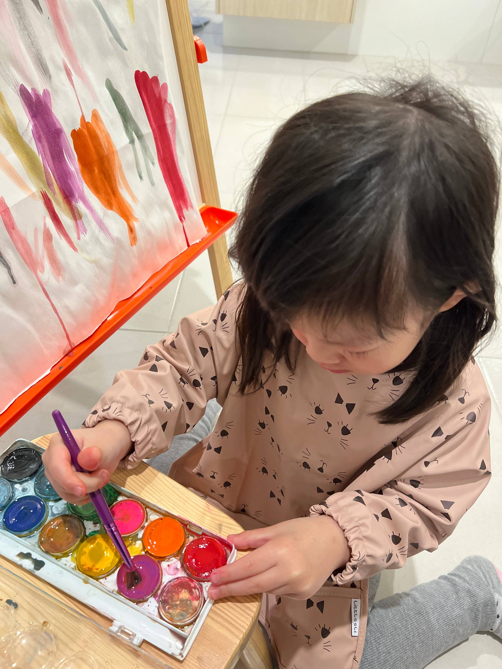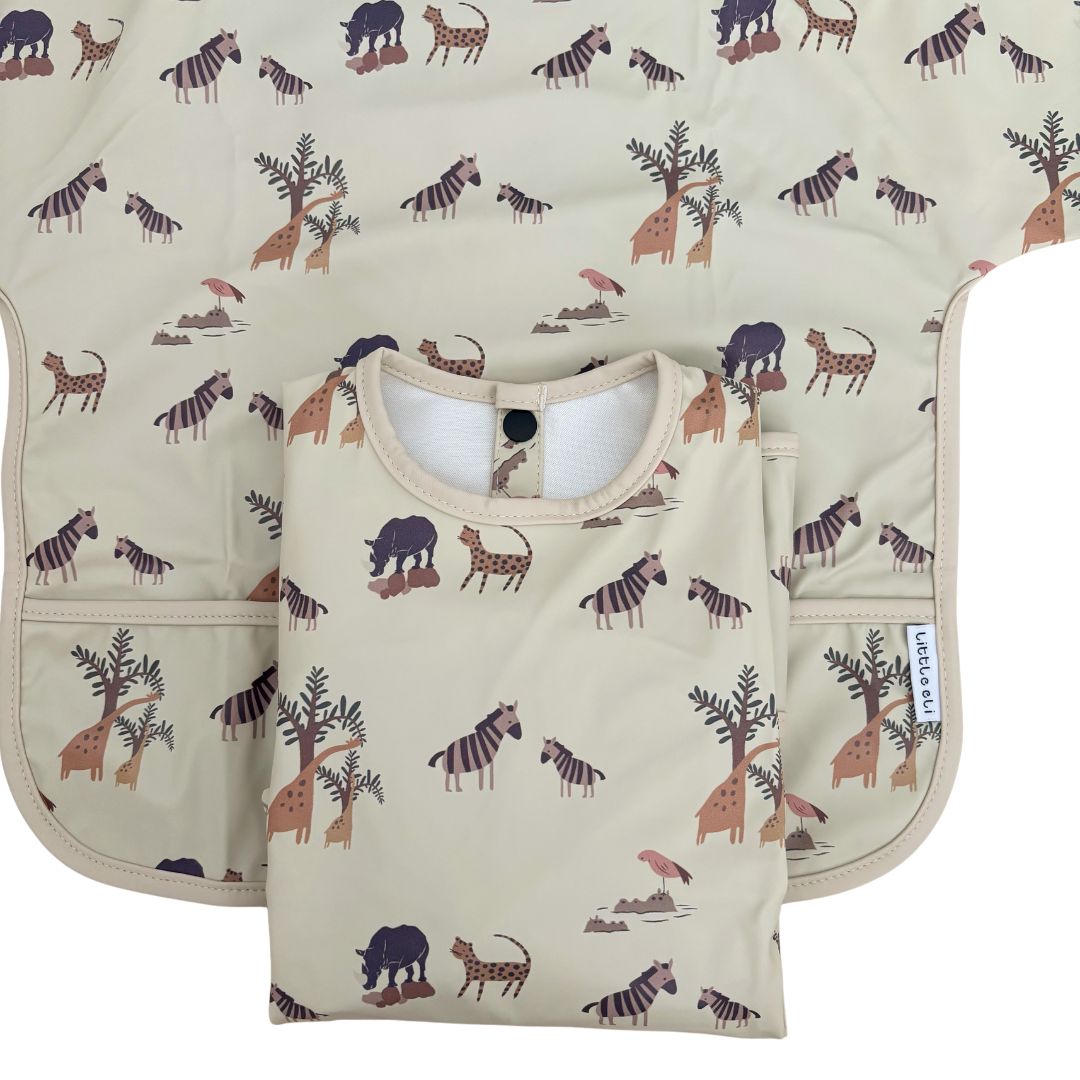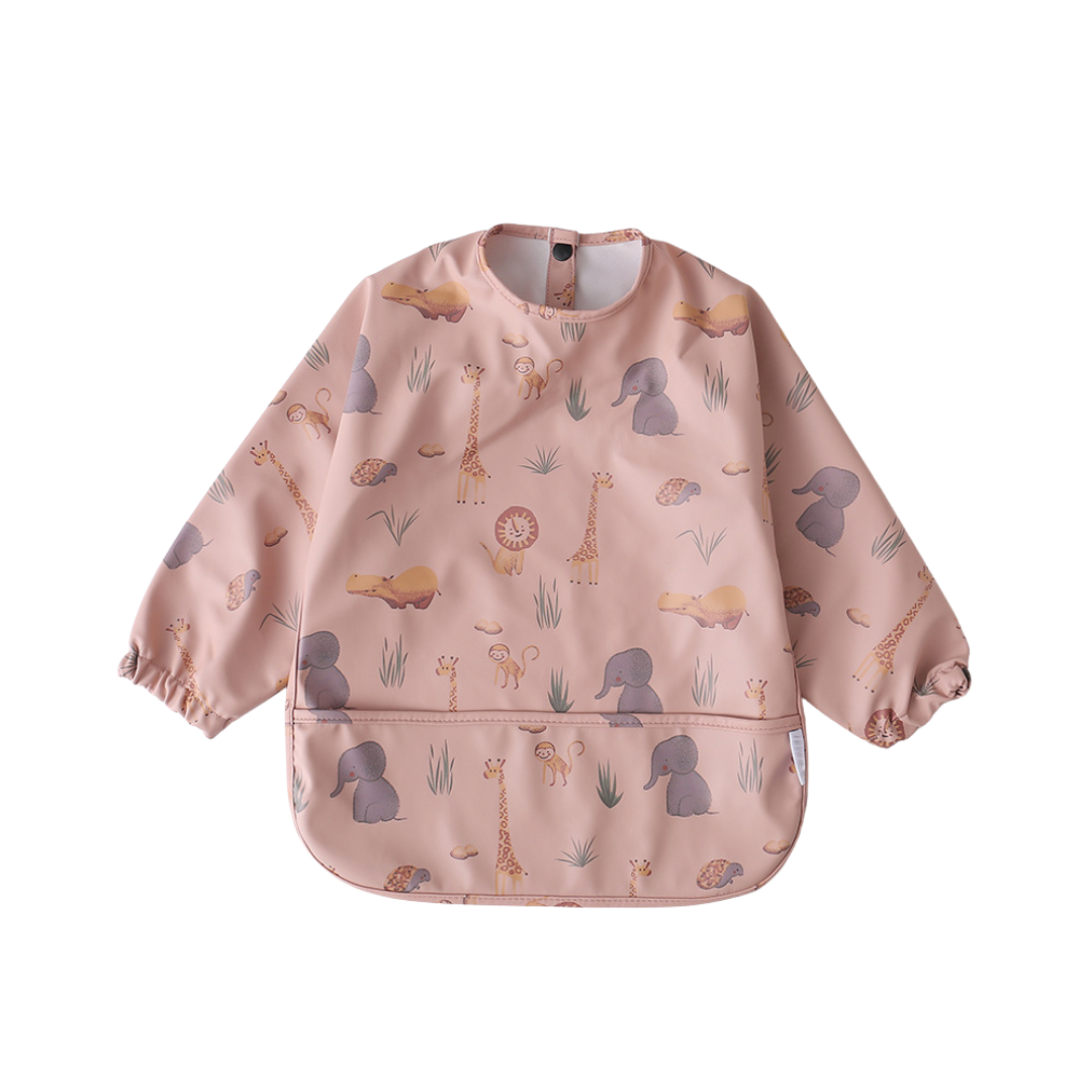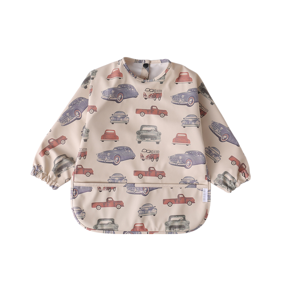 Each bib featuring a large pocket at the front designed to catch food with two-snap stud closure at the nape of neck and long sleeves with elastic cuffs. Beside meal time, it’s also suitable for art and craft sessions, painting or kitchen baking adventures.